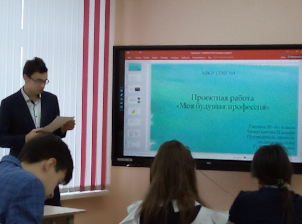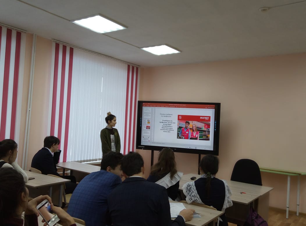 С прошлого учебного года в нашей школе стало традицией проведение профориентационного мероприятия среди 10 классников под названием «Моя профессия-мое будущее». Защита проектов с трансляцией презентации было организовано в кабинете, оснащенном современной техникой, «Точка роста». Данный проект направлен на выявление предпочтении в определенном профессиональном направлении. Окончив школу, человек должен сделать самый ответственный в своей жизни шаг – выбрать профессию. Профессия – это осознанно избранное русло, в которое нужно вкладывать много сил и времени. Очень важно, чтобы способности и черты характера соответствовали выбранному виду деятельности. Данная работа позволяет утвердиться в приоритетной профессии и целенаправленно идти по намеченному пути.