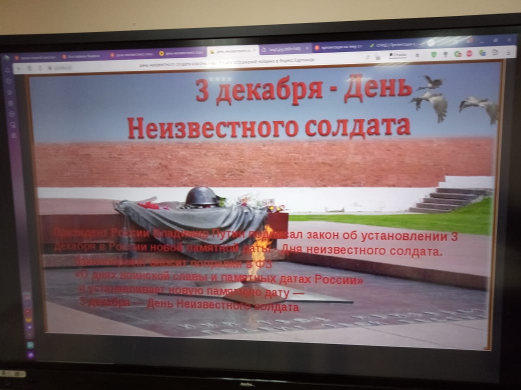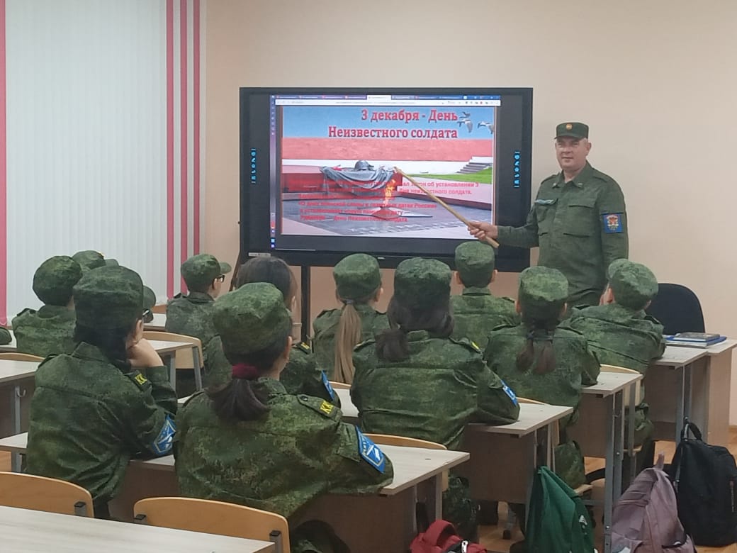 3 декабря в школе с учащимися 11 класса и кадетским классом прошел классный час, посвященный "Дню Неизвестного солдата". Эта важная дата установлена Указом Президента РФ для увековечения памяти, воинской доблести и бессмертного подвига наших воинов.
