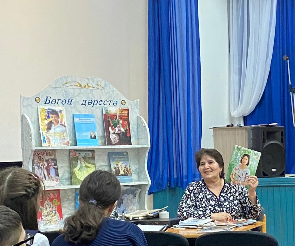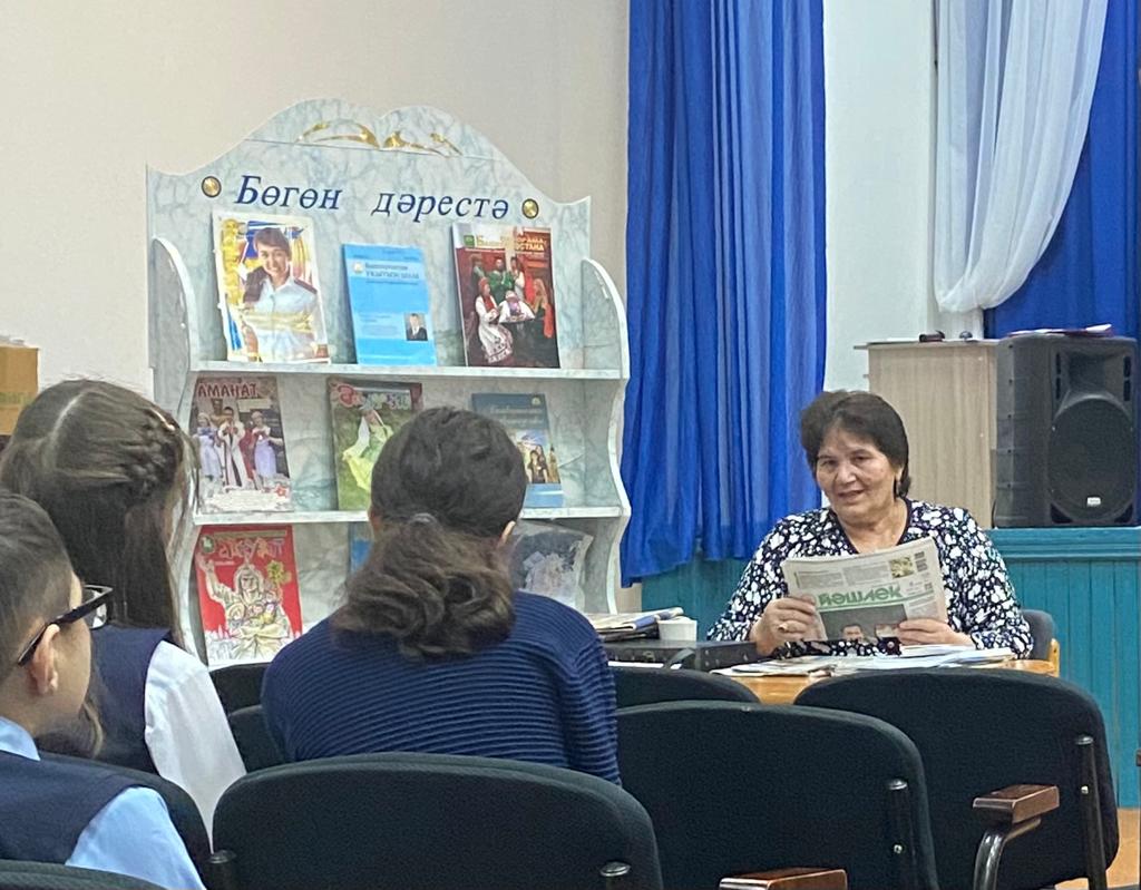 Һуңынан башҡорт телендә сыҡҡан гәзит , журналдар менән таныштырып үтте. Ике тиҫтәгә яҡын (“Башҡортостан”, “Йәншишмә”,”Йәшлек”, “Киске Өфө” ,”Ағиҙел”, “Аҡбуҙат”,” Аманат”, “ Башҡортостан ҡыҙы”, “Башҡортостан уҡытыусыһы”, “ Ватандаш”...һ.б) гәзит -журналдарға белешмә бирҙе. Мәктәпкә “Йәншишмә” гәзитенә яҙылыу квитанцияһын бүләк итте.